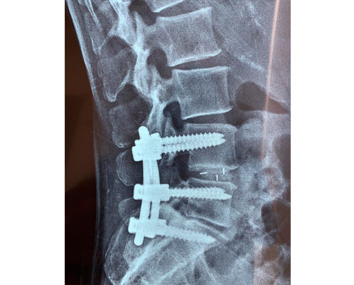 Último control radiográfico donde se observan los tornillos de titanio y la caja intersomtica ya integradas a su columna, con mejoría de 80 a 90 por ciento en sus molestias